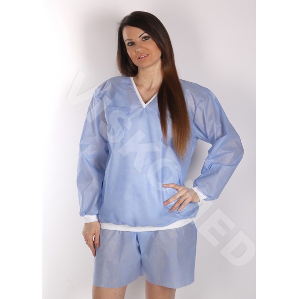 BLUZA OCHRONNA JEDNORAZOWA Z DŁUGIM RĘKAWEM ZAKOŃCZONA BAWEŁNIANYM MANKIETEM, Z JEDNĄ KIESZENIĄ, WYKONANA Z NIEPRZEŚIWTUJĄCEJ WŁÓKNINY SMMS
