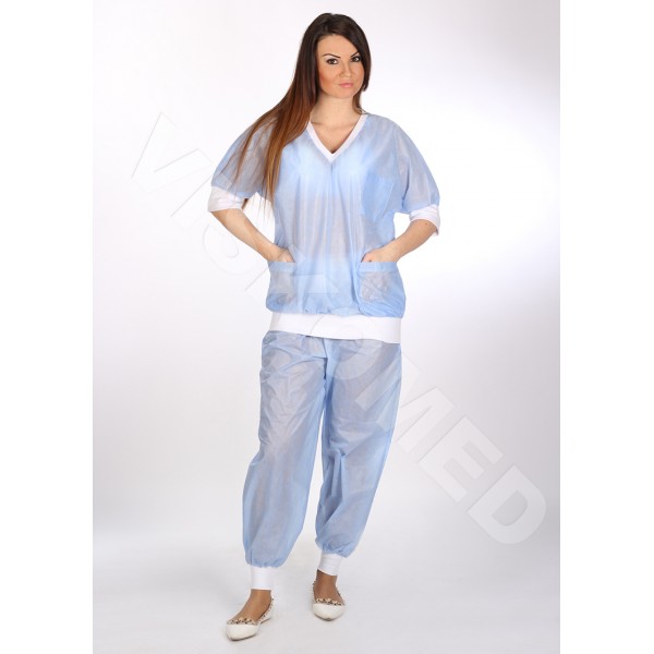 BLUZA OCHRONNA JEDNORAZOWA Z SZEROKIMI BAWEŁNIANYMI MANKIETAMI, RĘKAW 3/4, Z TRZEMA KIESZENIAMI, WYKONANA Z NIEPRZETUŚWJIĄCEJ WŁÓKNINY SMMS