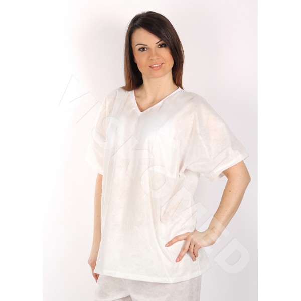 BLUZA JEDNORAZOWA W SEREK WYKONANA Z WŁÓKNINY WISKOZOWEJ, Z JEDNĄ KIESZENIĄ, SEREK WYKOŃCZONY BAWEŁNIANYM MANKIETEM